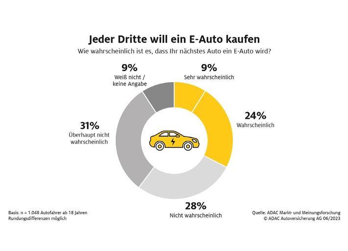 Elektroautos werden in Deutschland zunehmend beliebter. Im ersten Halbjahr 2023 wurden rund ein Drittel mehr E-Autos neu zugelassen als im Vorjahreszeitraum. Damit liegt ihr Anteil an allen Pkw-Neuzulassungen bei rund 16 Prozent. Auch mittelfristig dürfte sich der Trend zu E-Autos weiter verfestigen. Nach einer Umfrage der ADAC Autoversicherung geht jeder dritte Autofahrer davon aus, sich beim nächsten Fahrzeugwechsel für ein E-Auto zu entscheiden.